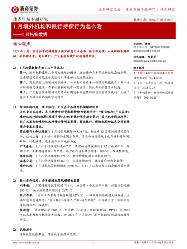 【浙商证券】【20240229】1月托管数据:1月境外机构和银行持债行为怎么看-11页 行业研究