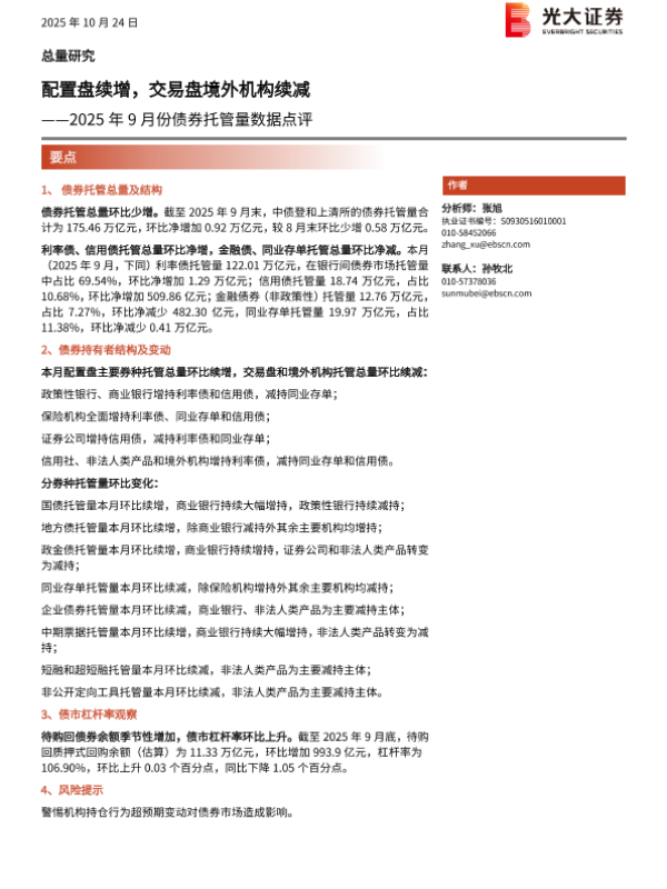 【光大证券】【202509】配置盘续增,交易盘境外机构续减——2025年9月份债券托管量数据点评-11页 证券期货研究报告