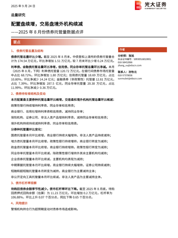 【光大证券】【202509】配置盘续增,交易盘境外机构续减——2025年8月份债券托管量数据点评-11页 证券期货研究报告