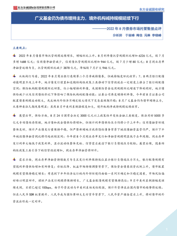 【东方金诚】【2022】2022年8月债券市场托管数据点评:广义基金仍为债市增持主力,境外机构减持规模延续下行-11页 行业研究