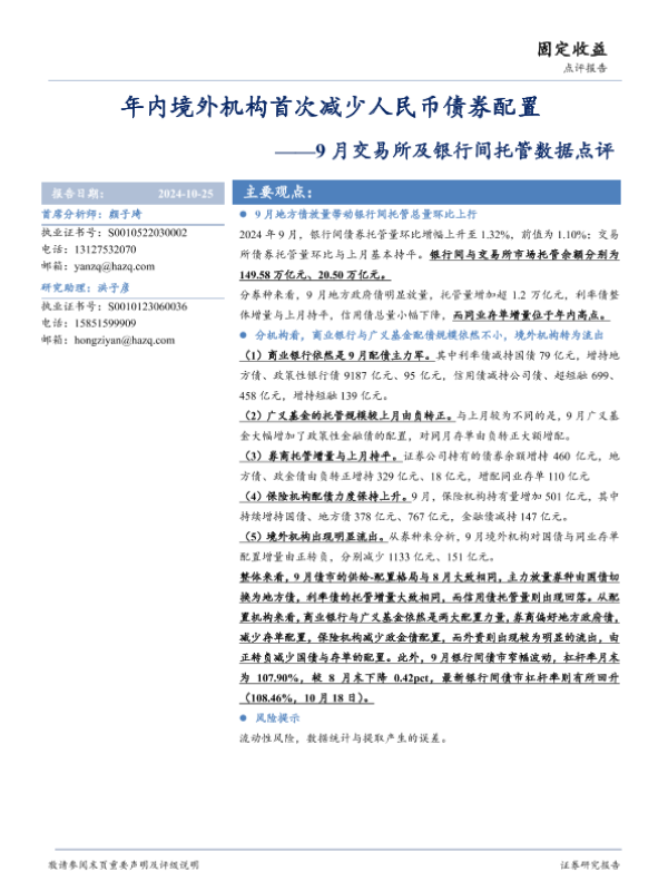 【华安证券】【20241025】9月交易所及银行间托管数据点评:年内境外机构首次减少人民币债券配置-16页 行业研究