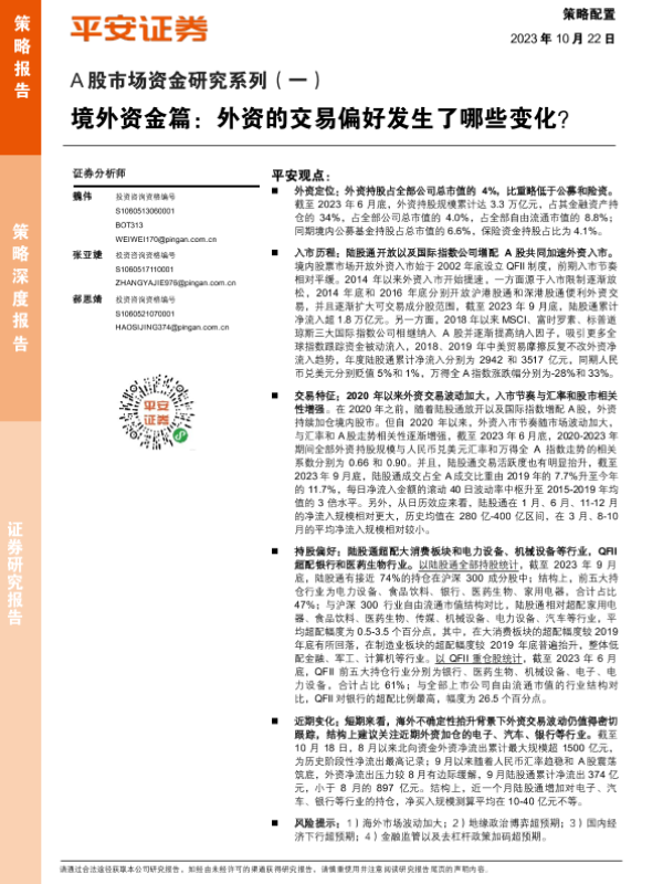 【平安证券】【20231022】A股市场资金研究系列(一):境外资金篇,外资的交易偏好发生了哪些变化?-20页 行业研究