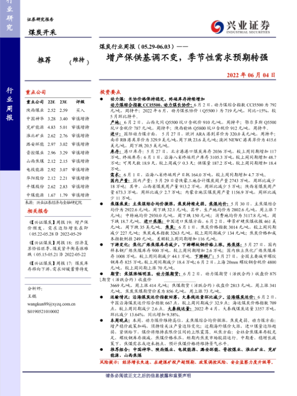 【兴业证券】【20220604】煤炭行业周报(05.29-06.03)——增产保供基调不变,季节性需求预期转强-12页 行业研究