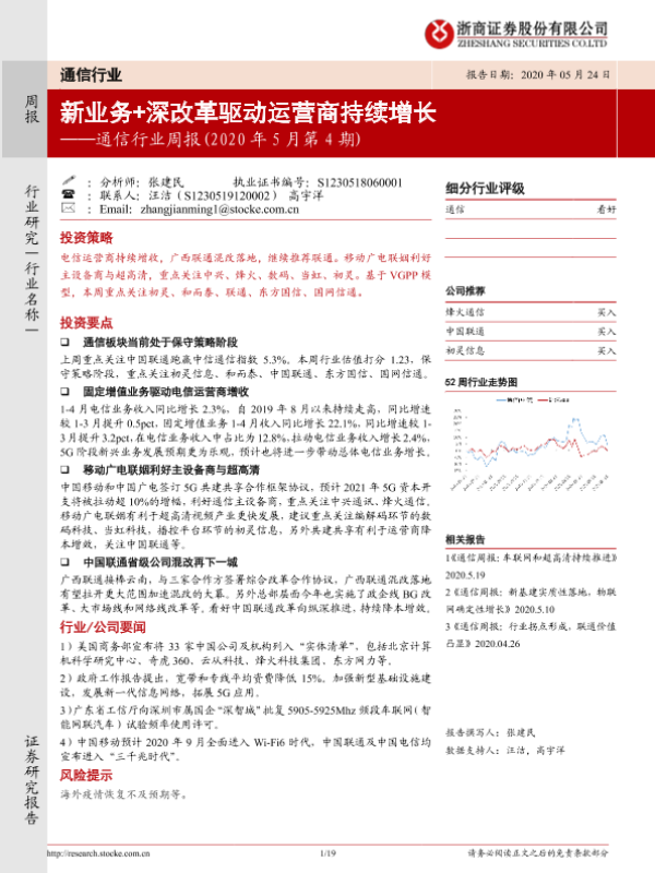 【浙商证券】【20200524】通信行业周报(2020年5月第4期):新业务+深改革驱动运营商持续增长-19页 行业研究