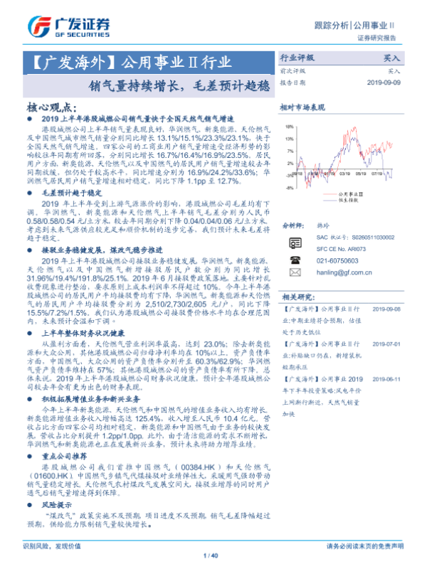 【广发证券】【20190909】公用事业Ⅱ行业跟踪分析:销气量持续增长,毛差预计趋稳-40页 行业研究