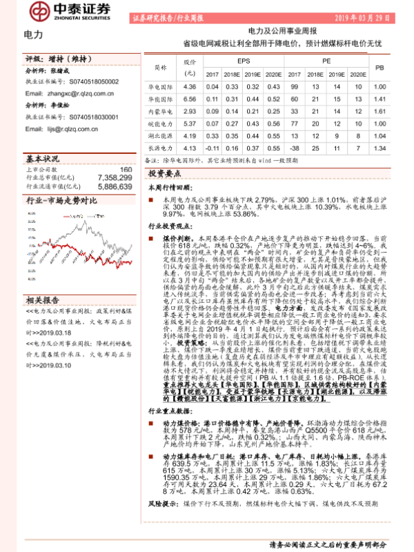 【中泰证券】【20190310】电力及公用事业周报:降税利好&电价无虞&煤价承压,火电布局正当时-16页 行业研究