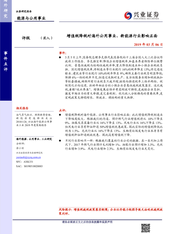 【兴业证券】【20190306】增值税降税对海外公用事业、新能源行业影响正面-4页 行业研究
