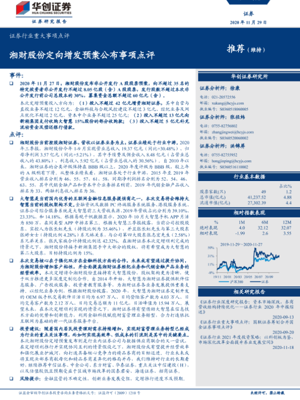 【华创证券】【20201129】证券行业重大事项点评:湘财股份定向增发预案公布事项点评-4页 行业研究