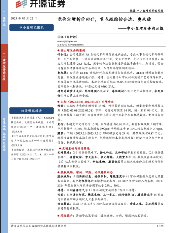 【开源证券】【20230522】中小盘定增并购月报:竞价定增折价回升,重点跟踪怡合达、奥来德-26页 行业研究
