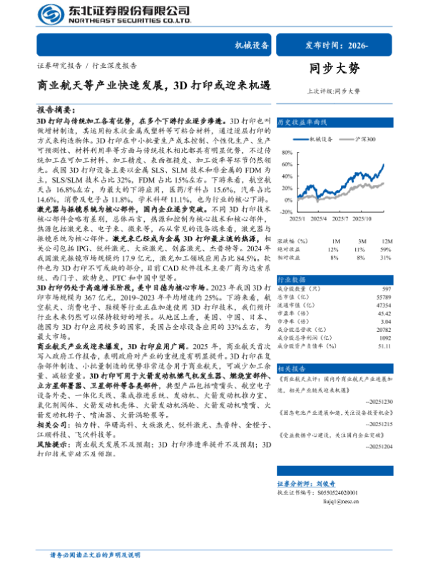 【东北证券】【202601】机械设备行业:商业航天等产业快速发展,3D打印或迎来机遇-32页 证券期货研究报告