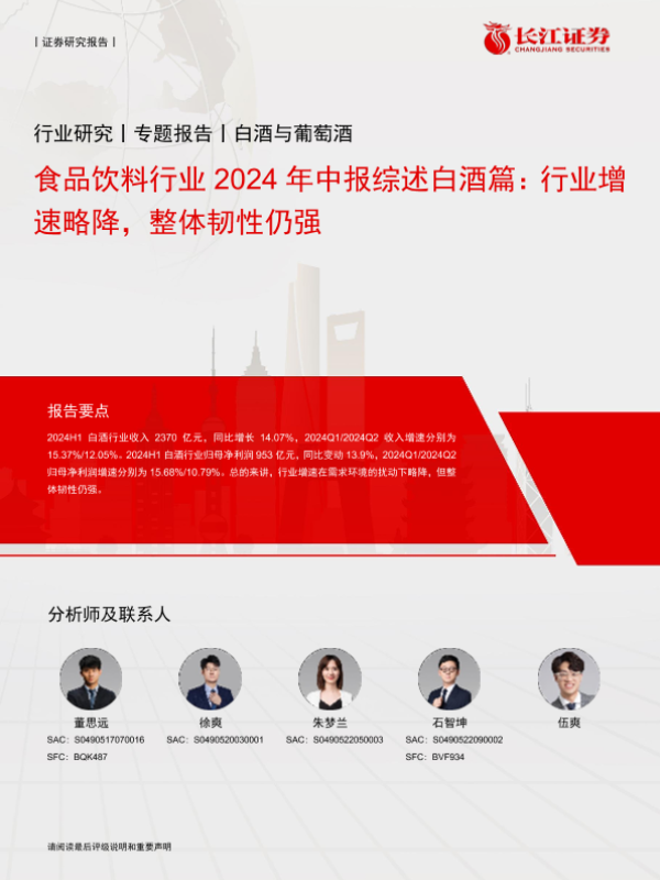 【长江证券】【20240922】食品饮料行业2024年中报综述白酒篇:行业增速略降,整体韧性仍强-17页 行业研究