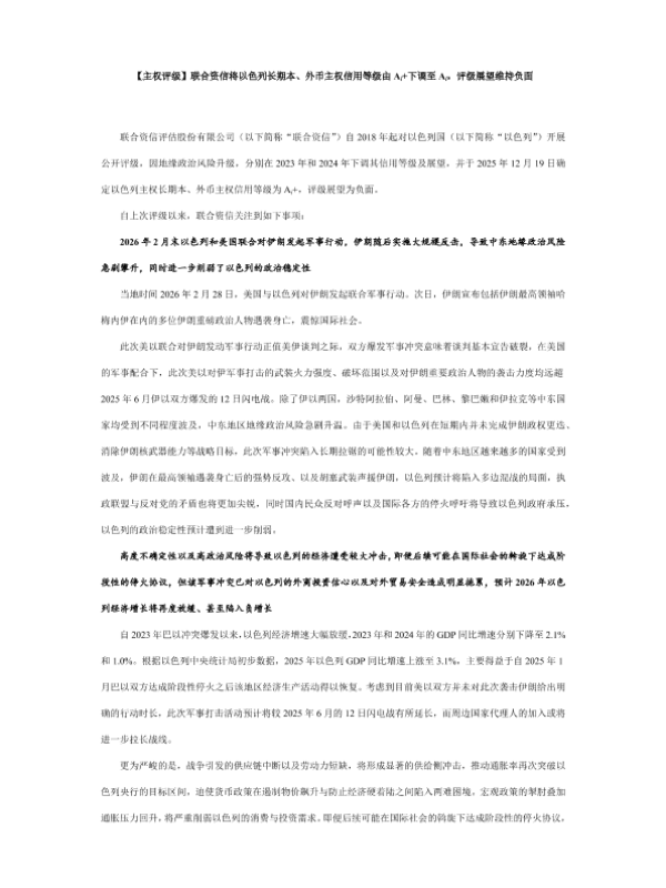 【联合资信】【202512】联合资信将以色列长期本、外币主权信用等级由Ai+下调至Ai,评级展望维持负面-2页 行业研究