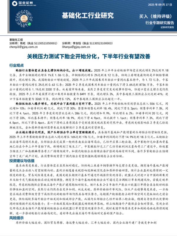 【国金证券】【202509】基础化工行业研究:关税压力测试下胎企开始分化,下半年行业有望改善-24页 证券期货研究报告
