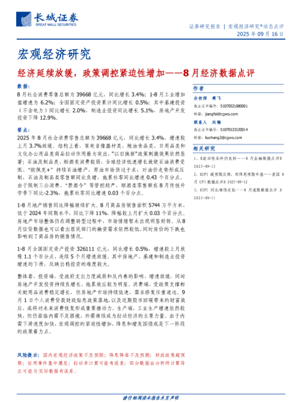 【长城证券】【202509】经济延续放缓,政策调控紧迫性增加——8月经济数据点评-10页 证券期货研究报告