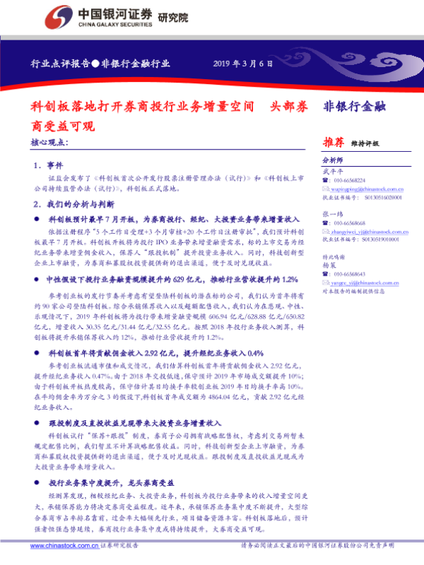 【银河证券】【20190306】非银行金融行业:科创板落地打开券商投行业务增量空间 头部券商受益可观-9页 行业研究