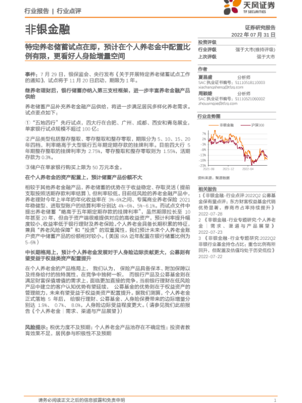 【天风证券】【20220731】非银金融行业点评:特定养老储蓄试点在即,预计在个人养老金中配置比例有限,更看好人身险增量空间-2页 行业研究