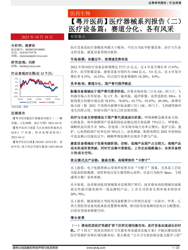 【粤开证券】【20231019】医药生物行业医疗器械系列报告(二)医疗设备篇:赛道分化、各有风采-22页 行业研究