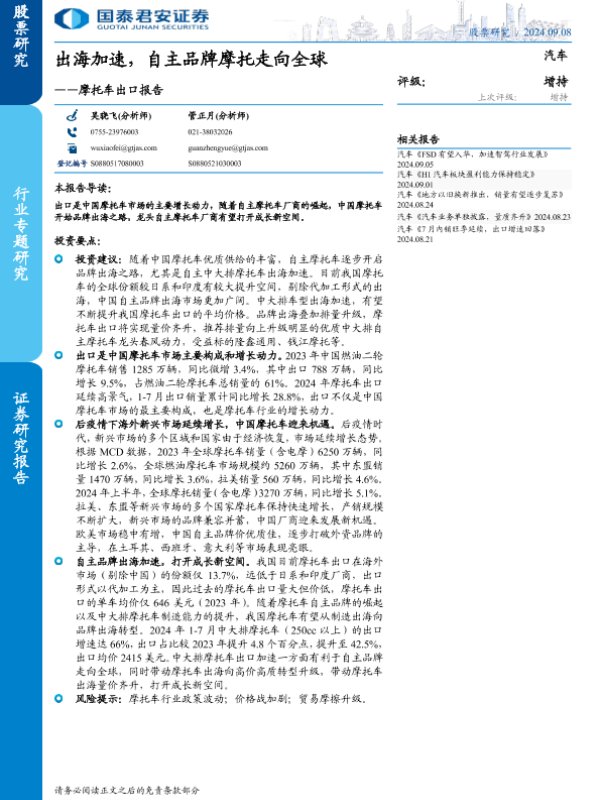 【国泰君安证券】【20240908】2024年09月08日更新-【国泰君安】汽车行业专题研究:摩托车出口报告,出海加速,自主品牌摩托走向全球-20页 行业研究