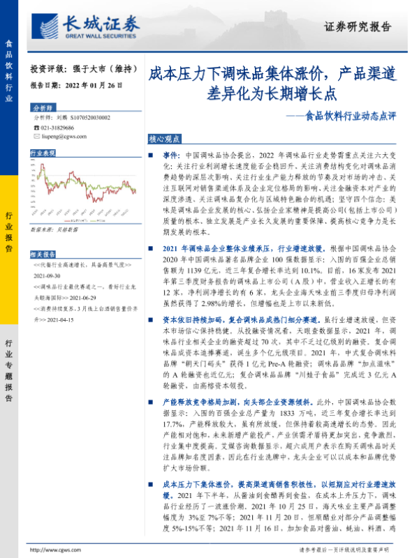 【长城证券】【20220126】食品饮料行业动态点评:成本压力下调味品集体涨价,产品渠道差异化为长期增长点-4页 行业研究