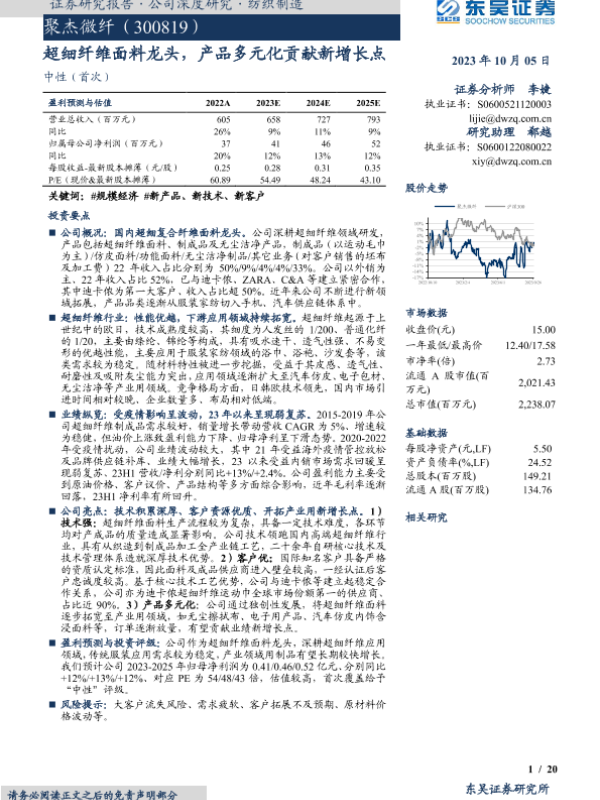 【东吴证券】【20231005】聚杰微纤-300819.SZ-超细纤维面料龙头,产品多元化贡献新增长点-20页 行业研究