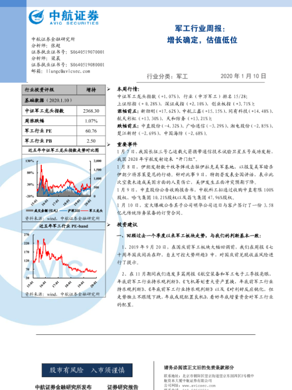 【中航证券】【20200110】20200110-中航证券-军工行业周报:增长确定,估值低位-4页 行业研究
