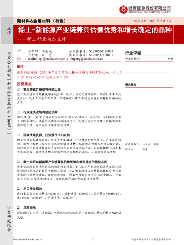 【浙商证券】【20210705】稀土-新能源产业链兼具估值优势和增长确定的品种-2页 行业研究