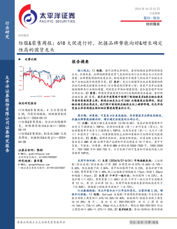 【太平洋证券】【20240602】20240602-太平洋-纺服&零售行业周报:618大促进行时,把握品牌势能向好&增长确定性高的国货龙头-16页 行业研究