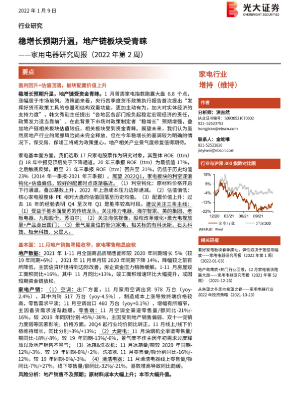 【光大证券】【20220109】稳增长预期升温,地产链板块受青睐——家用电器研究周报(2022年第2周)-24页 行业研究