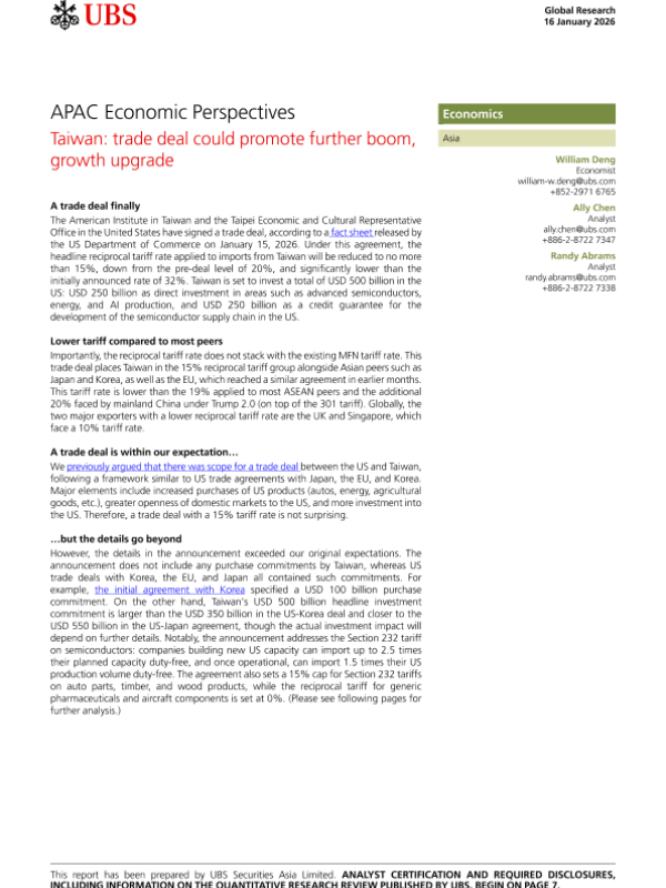 【UBS】【202601】APAC Economic Perspectives Taiwan trade deal could promote further boom, growth upgrade-10页 证券期货研究报告