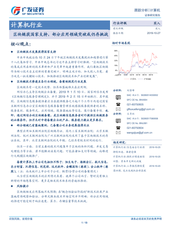【广发证券】【20191027】计算机行业跟踪分析:区块链获国家支持,部分应用领域突破或仍存挑战-13页 行业研究