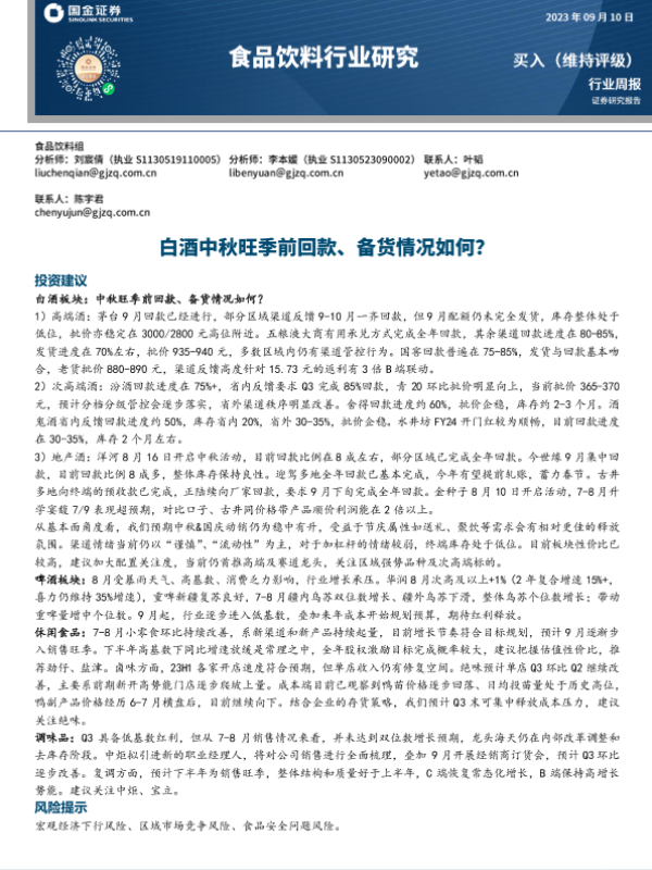 【国金证券】【20230911】2023年09月11日更新-【国金证券】食品饮料行业研究-白酒中秋旺季前回款、备货情况如何-11页 行业研究