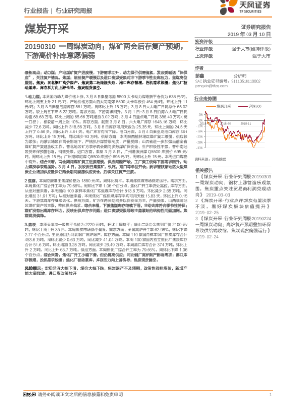 【天风证券】【20190310】20190310-天风证券-一周煤炭动向:煤矿两会后存复产预期,下游高价补库意愿偏弱-19页 行业研究