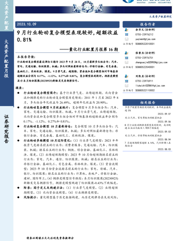 【国泰君安证券】【20231009】量化行业配置月报第16期:9月行业轮动复合模型表现较好,超额收益0.81%-16页 行业研究