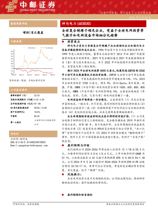 【中邮证券】【20240926】神马电力(603530)全球复合绝缘子领先企业,受益于全球电网投资景气提升和电网设备市场细分化趋势-25页 行业研究