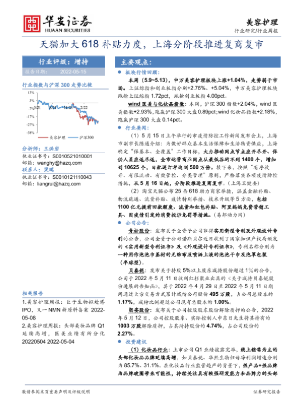 【华安证券】【20220515】美容护理行业周报:天猫加大618补贴力度,上海分阶段推进复商复市-19页 行业研究