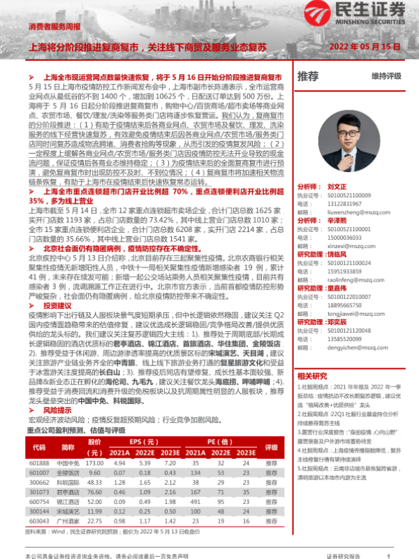 【民生证券】【20220515】消费者服务周报:上海将分阶段推进复商复市,关注线下商贸及服务业态复苏-22页 行业研究