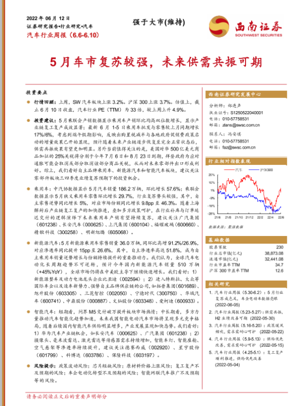 【西南证券】【20220612】汽车行业周报:5月车市复苏较强,未来供需共振可期-15页 行业研究