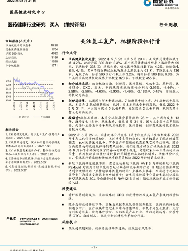 【国金证券】【20220531】医药健康行业研究周报:关注复工复产,把握阶段性行情-18页 行业研究