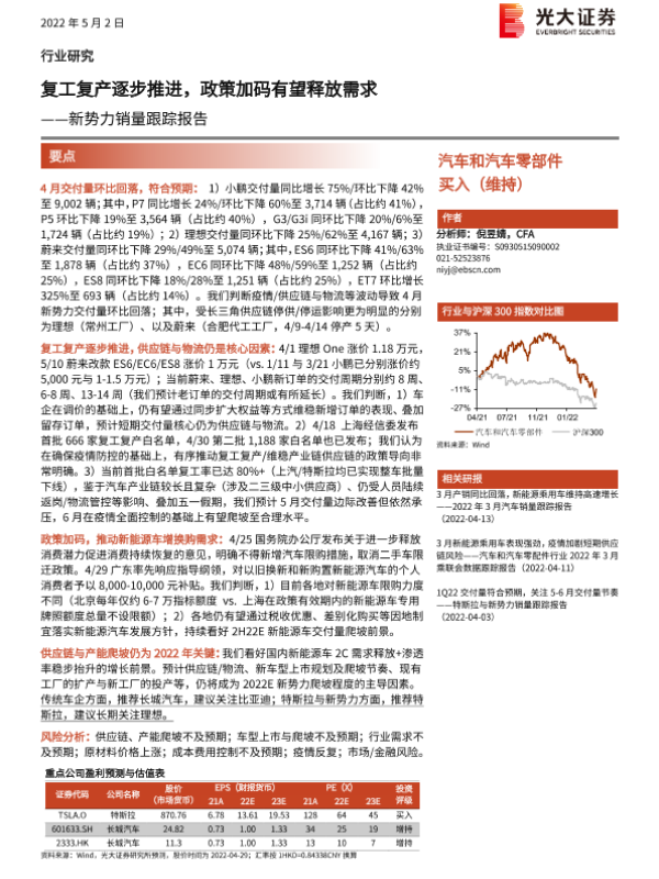 【光大证券】【20220502】新势力销量跟踪报告:复工复产逐步推进,政策加码有望释放需求-2页 行业研究