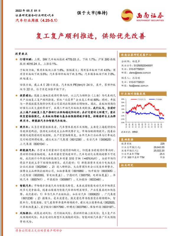 【西南证券】【20220501】汽车行业周报:复工复产顺利推进,供给优先改善-14页 行业研究
