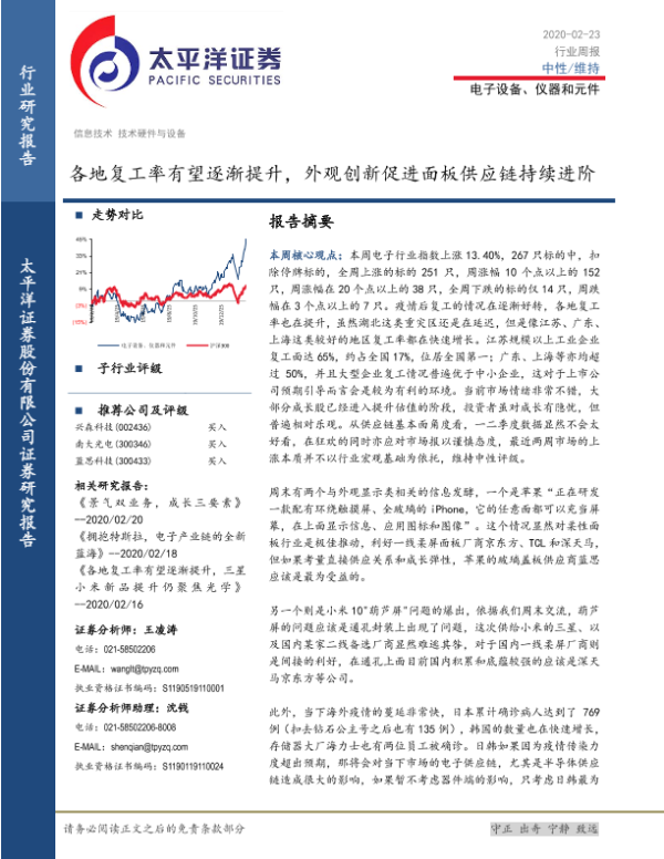 【太平洋证券】【20200223】20200223-太平洋-电子设备、仪器和元件行业周报:各地复工率有望逐渐提升,外观创新促进面板供应链持续进阶-15页 行业研究