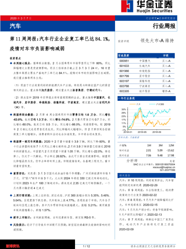 【华金证券】【20200307】汽车第11周周报:汽车行业企业复工率已达84.1%,疫情对车市负面影响减弱-12页 行业研究