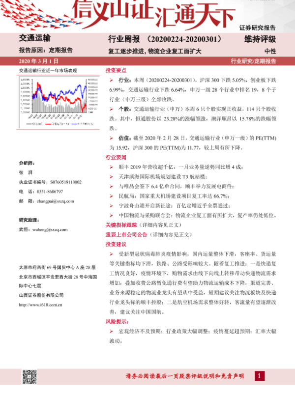 【山西证券】【20200301】交通运输行业周报:复工逐步推进,物流企业复工面扩大-15页 行业研究