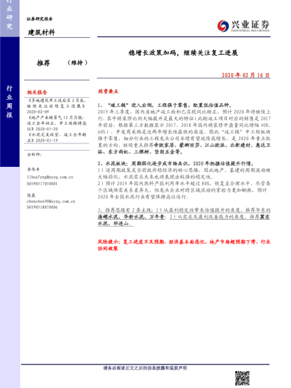 【兴业证券】【20200216】稳增长政策加码,继续关注复工进展-16页 行业研究