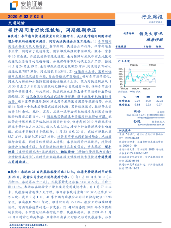 【安信证券】【20200202】疫情期间看好快递板块,周期短期承压-19页 行业研究