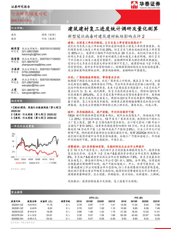 【华泰证券】【20200218】新型冠状病毒对建筑建材板块影响点评2:建筑建材复工进度统计调研及量化测算-29页 行业研究