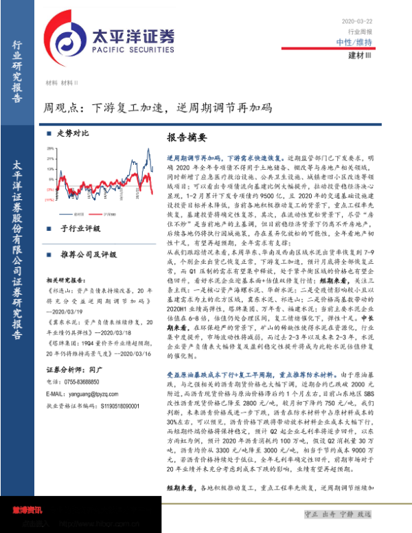 【太平洋证券】【20200322】建材Ⅲ周观点:下游复工加速,逆周期调节再加码-21页 行业研究