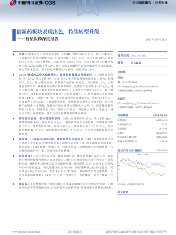 【银河证券】【20240828】复星医药(600196)深度报告:创新药板块表现出色,持续转型升级-22页 行业研究