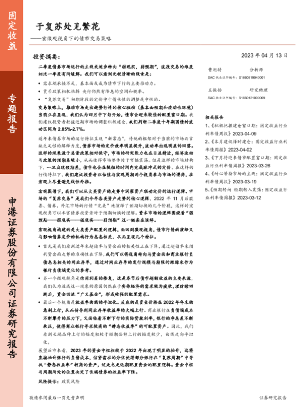 【申港证券】【20230413】宏微观视角下的债市交易策略:于复苏处见繁花-20页 行业研究