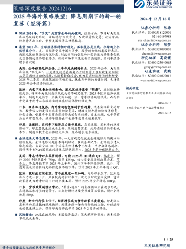 【东吴证券】【20241216】2025年海外策略展望:降息周期下的新一轮复苏(经济篇)-25页 宏观策略